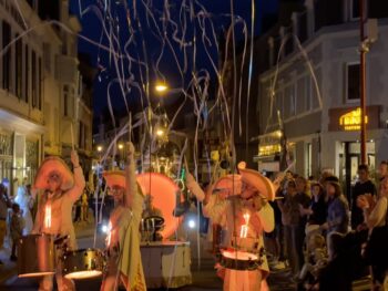 Percussiespelers, uitgedost in weelderige en prachtige kostuums met glinsterende details, marcheren op theatrale wijze door het publiek.