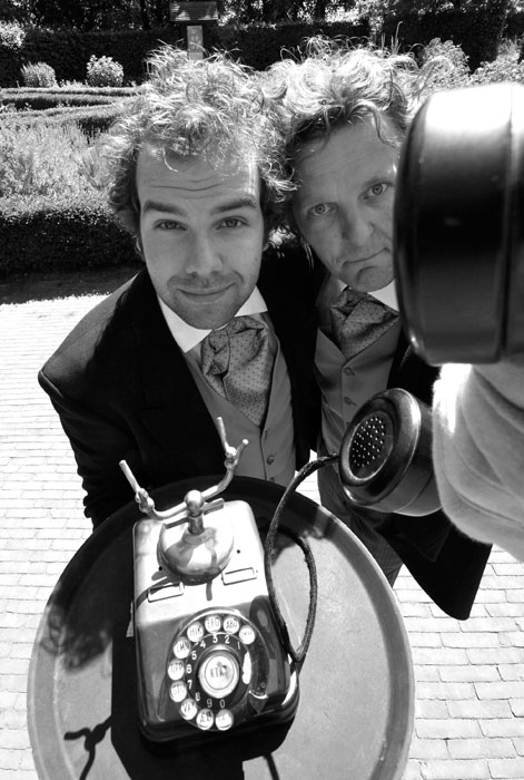Twee butlers dragen een dienblad met daarop een telefoon.