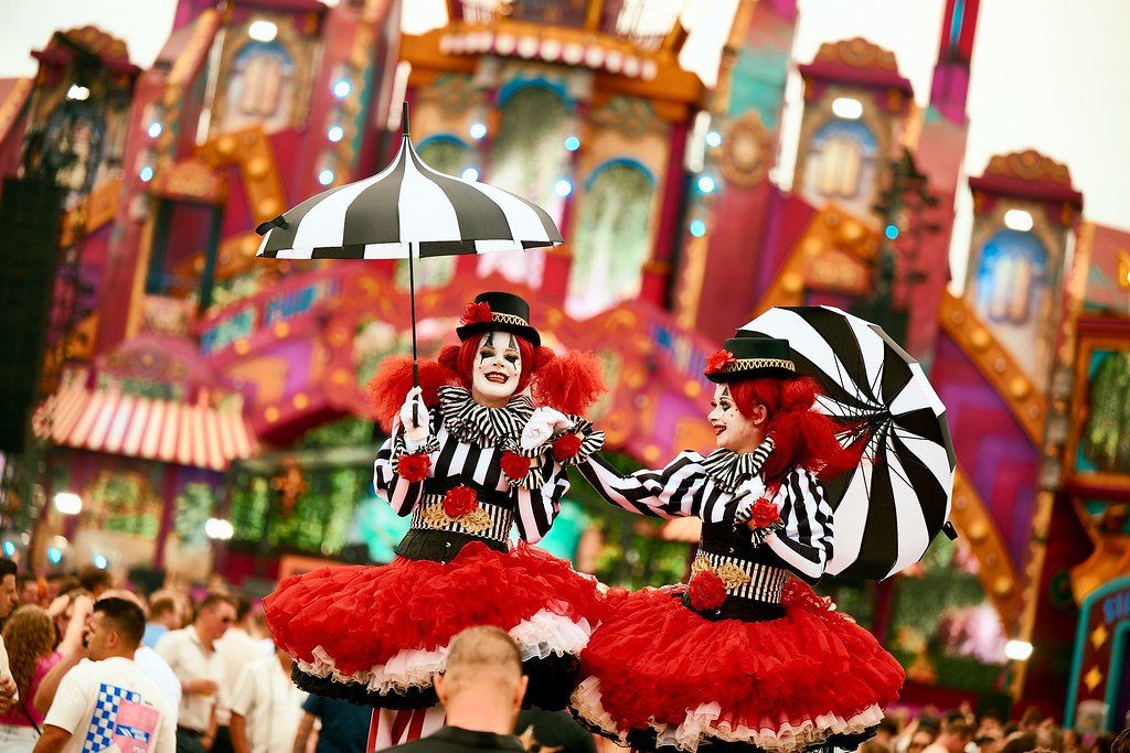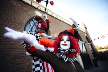 Buiten de circustent, verrassende clowns, die de straten vullen met vrolijkheid en acrobatie!