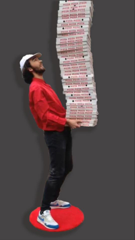 Hij is op zoek naar degene die de Quatro Staggioni heeft besteld en balanceert met 28 pizzadozen door de mensenmenigte.
