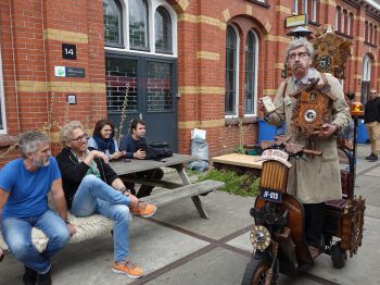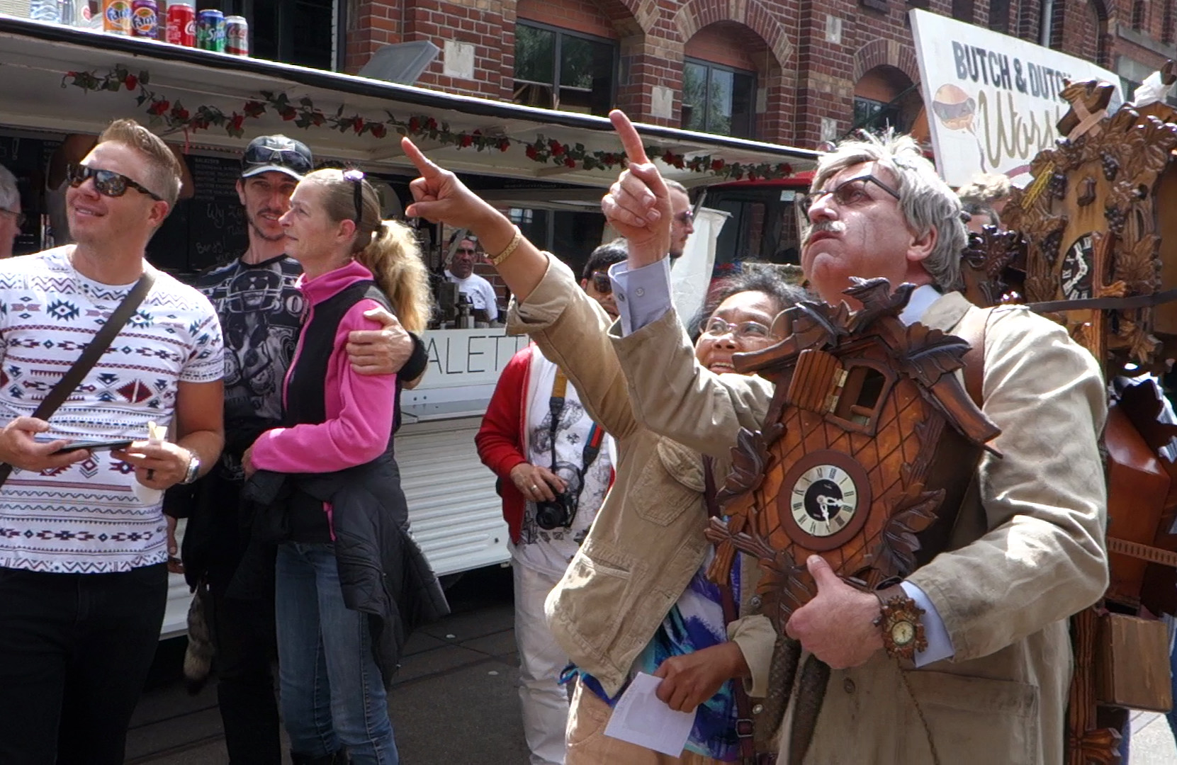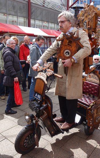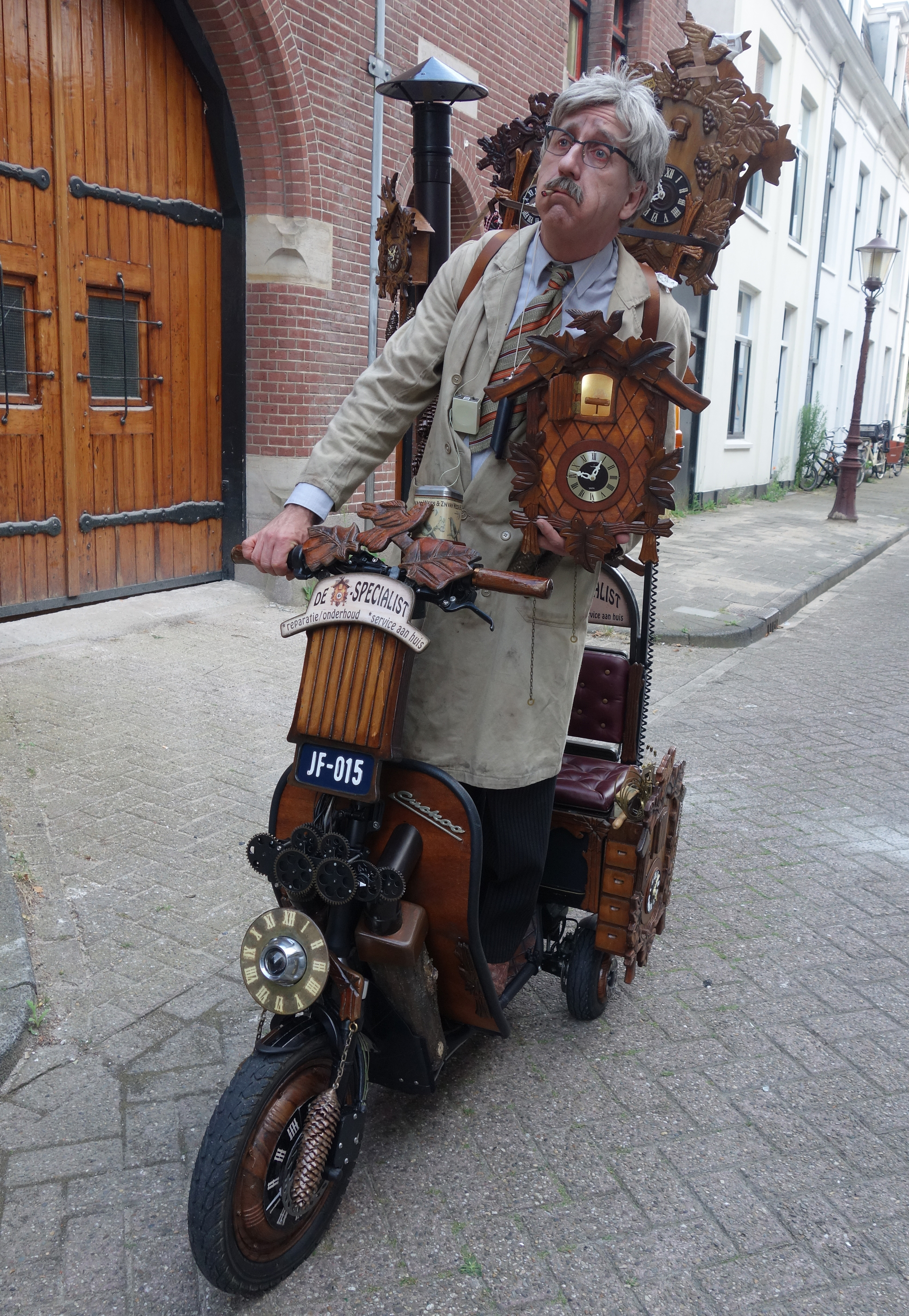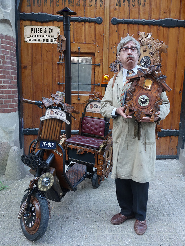 De klokkenmaker is een niet-gesproken mobiele act, geschikt voor festivals, markten, winkelcentra e.d.