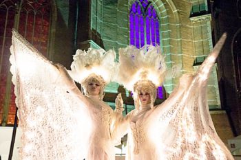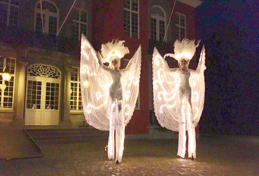 Witte steltenfiguren dansen met hun lichtgevende kanten mantels statig door de straten. De wind waait door de veren van hun pruiken, en tilt hun mantels op terwijl zij voortschrijden, hun verlichte lichamen doen ons aan engelen denken.