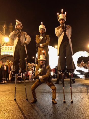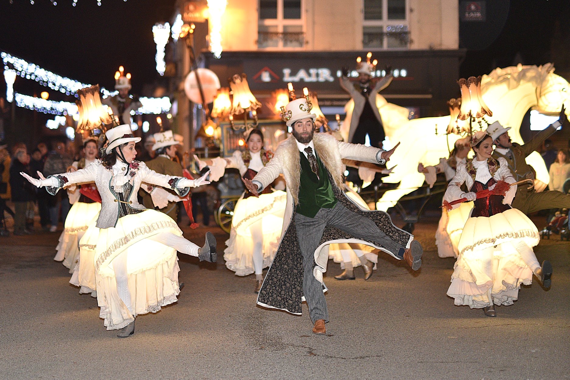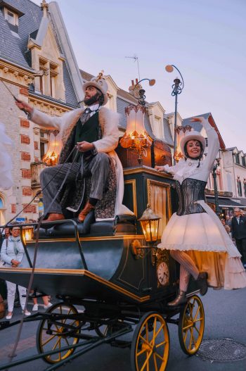 Maak kennis met onze prachtige steltenlopers, onze lampionnen, onze rondfladderende lampenkapdames en onze twee vluchtige minnaars. Portretten die te lang zijn blijven stilstaan, ontsnapt uit de schilderijen van Renoir, Degas en Mucha. De personages laten het publiek kennismaken met een grillige wereld. De reizigers uit het verleden ontwaken om in uw straten te dansen!